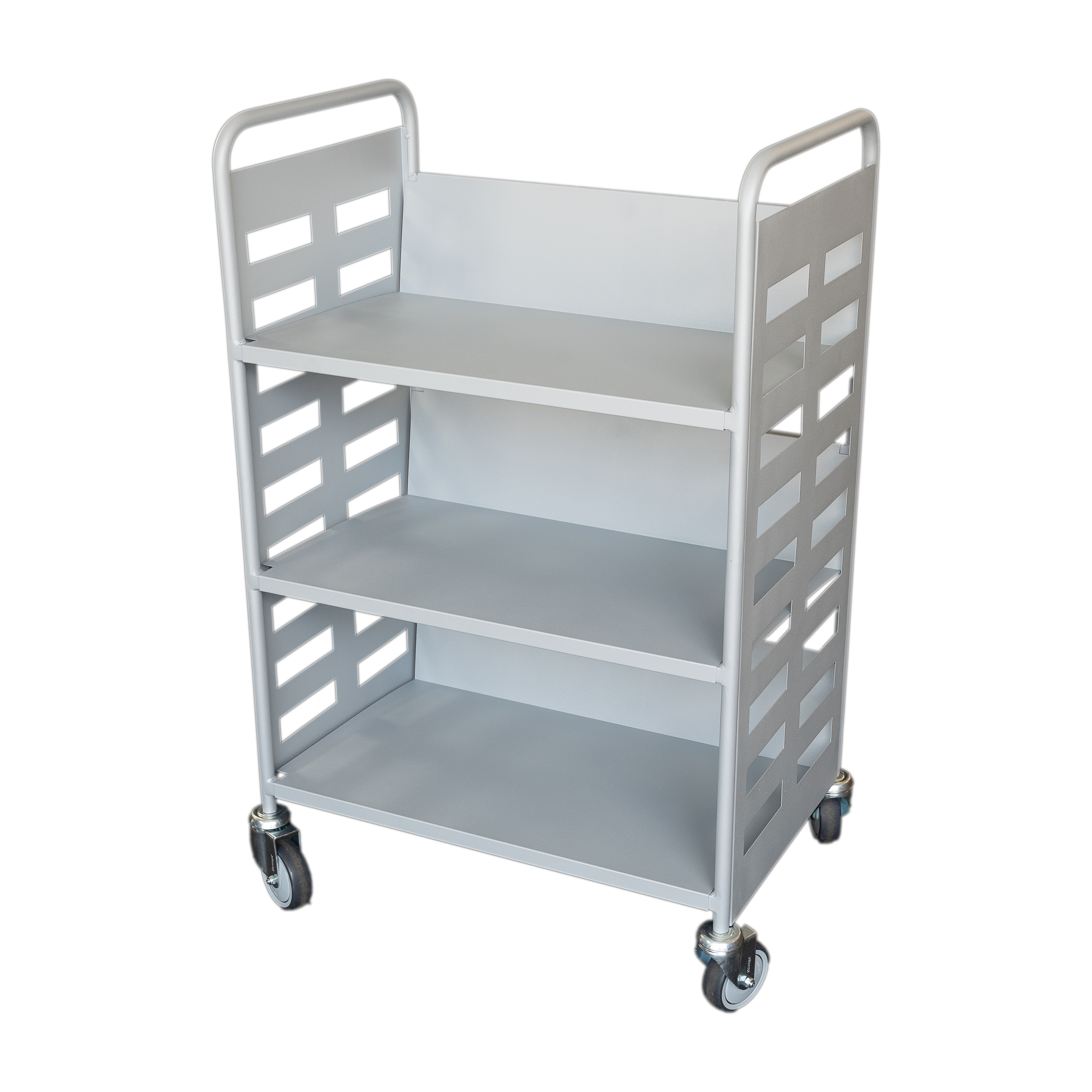 Masszív felépítésű könyvtári szállítókocsi fémszerkezettel és fa polcokkal a könyvek biztonságos szállításához és tárolásához.