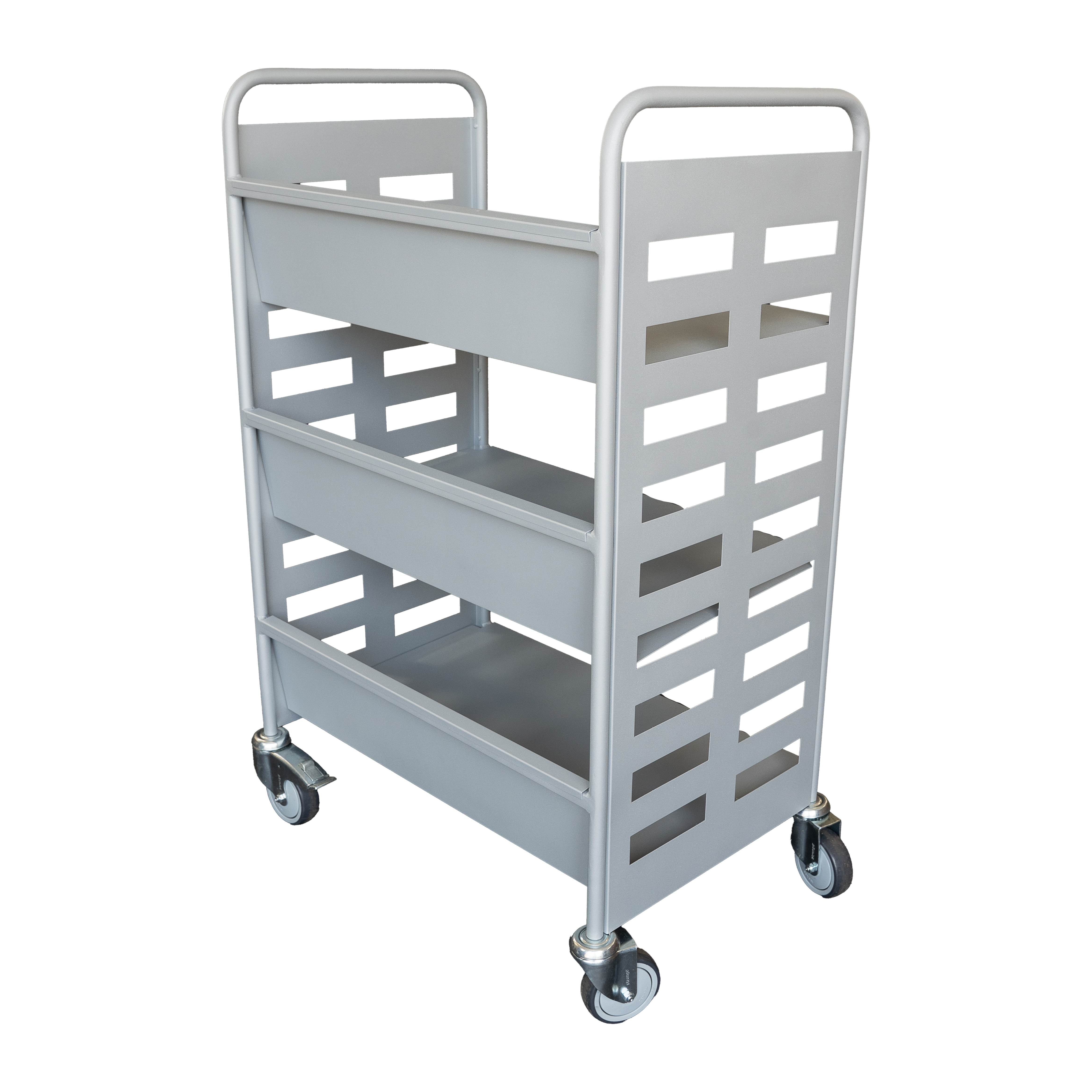 A kocsi 3 fix kerékkel és 1 fékezhető kerékkel van felszerelve, a kerekek átmérője 10 cm. Kérés esetén rendkívül csendes kivitelű kerekekkel is rendelhető, például zajérzékeny környezetekbe (olvasótermek, iskolák).