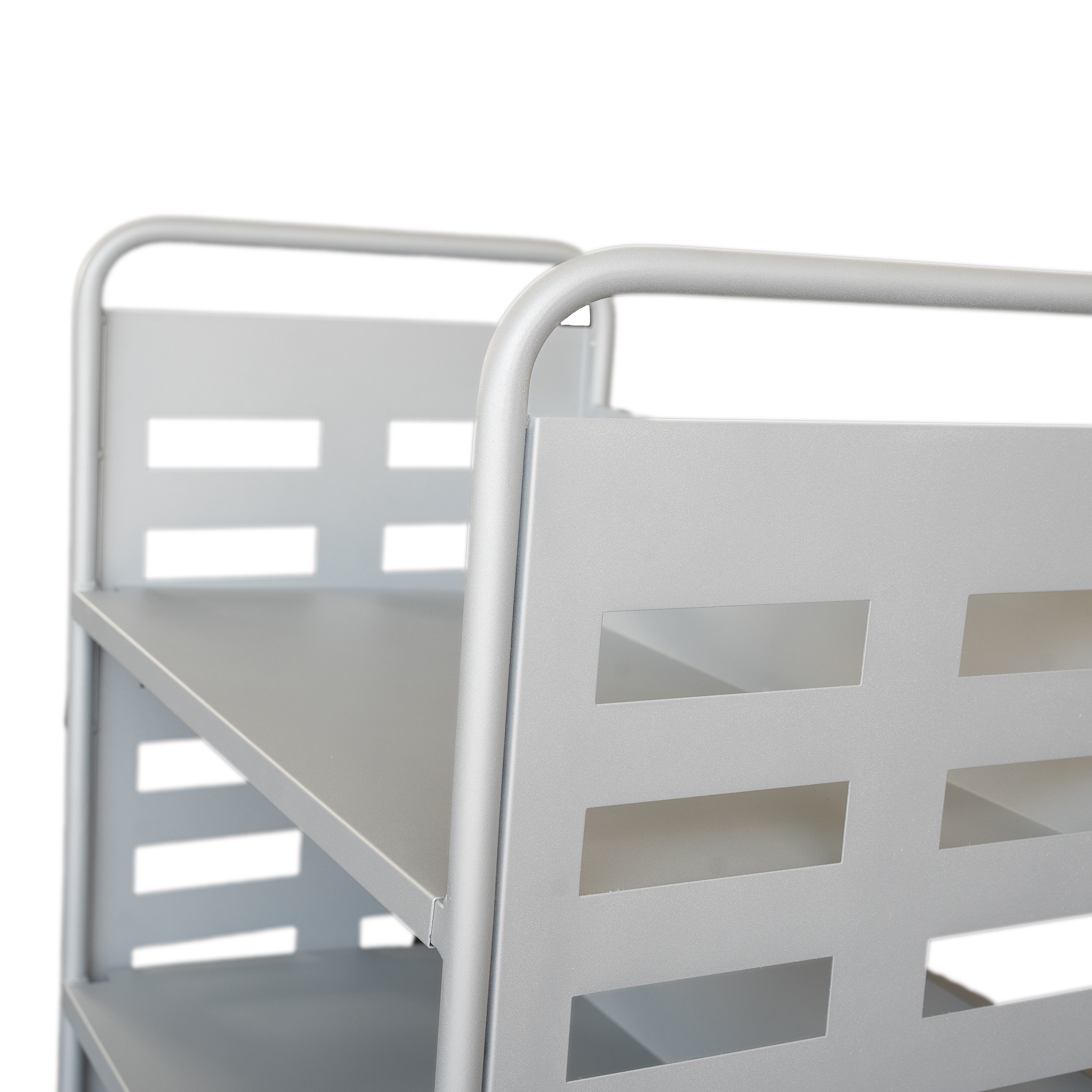 A Matylda könyvtári kocsi teljes egészében fémből készült, kivételesen nagy teherbírású modell, amelyet kifejezetten az Önök igényei alapján terveztünk, három mély tárolópolccal. A modern, perforált oldallemezek dizájnelemként is szolgálnak, miközben szerkezeti stabilitást biztosítanak.